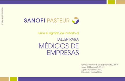 Nous avons le plaisir de vous inviter à l'atelier de notre affilié Sanofi Pasteur, qui aura lieu à San Jose, le 8 septembre 2017 dans les locaux de L'Hôtel Park inn de 9 am à 3 PM.