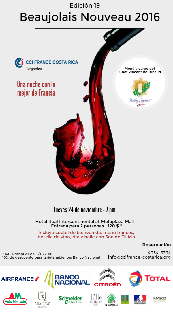 La Cámara de Comercio e Industria FRANCE COSTA RICA le invita a la 19° edición de la fiesta del Beaujolais Nouveau, que se llevará a cabo el jueves 24 de noviembre del 2016 en el Hotel Real Intercontinental at Multiplaza Mall, Escazú.