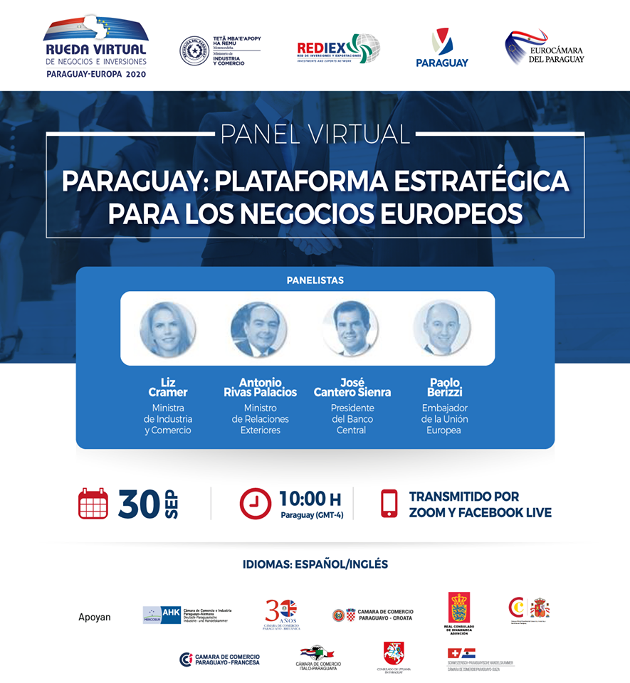 Nous vous adressons cette invitation de la Chambre de commerce franco-paraguayenne au séminaire "Paraguay : plate-forme stratégique pour les entreprises européennes", "Table ronde virtuelle sur les entreprises et les investissements Paraguay - Europe 2020".