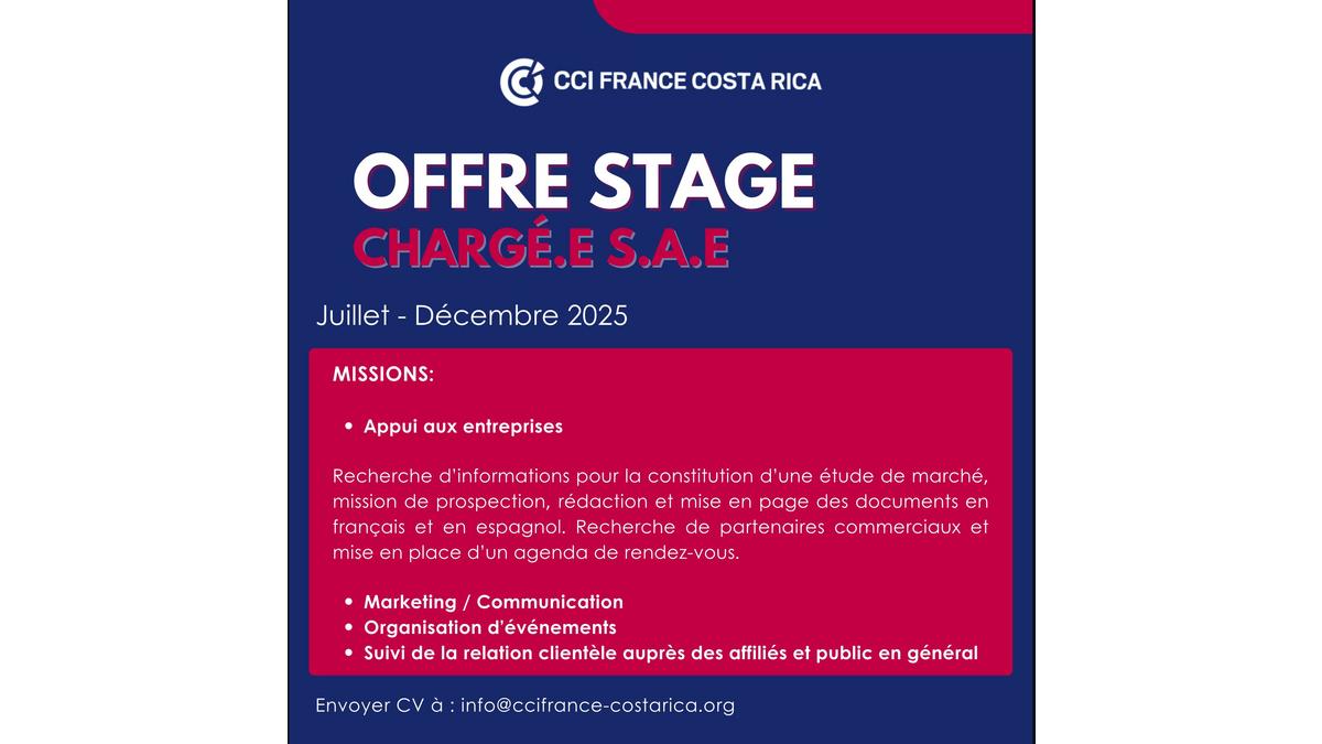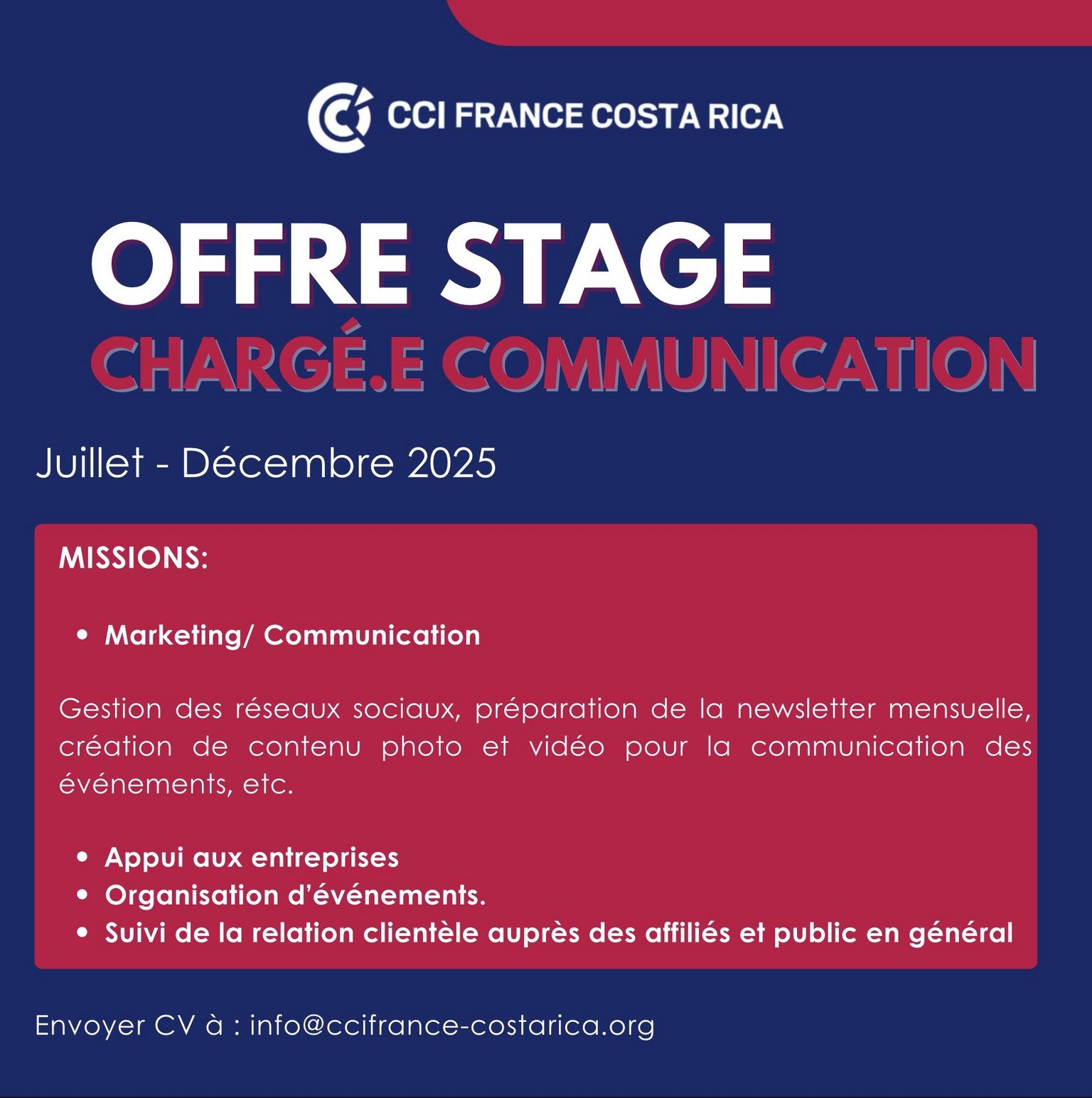Dans le cadre de ses activités, la CCI France Costa Rica propose deux offres de stage pour la période de juillet à décembre 2025 :