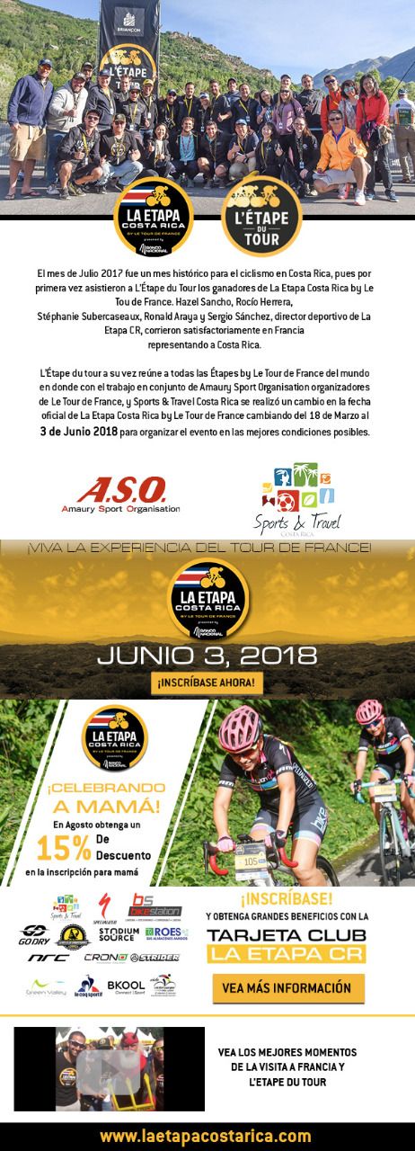 L'équipe de Sports and Travel Costa Rica change la date de la seconde édition de La Etapa Costa Rica by Le Tour de France pour une meilleure adéquation au calendrier international. L'événement aura donc lieu le 3 juin 2018.