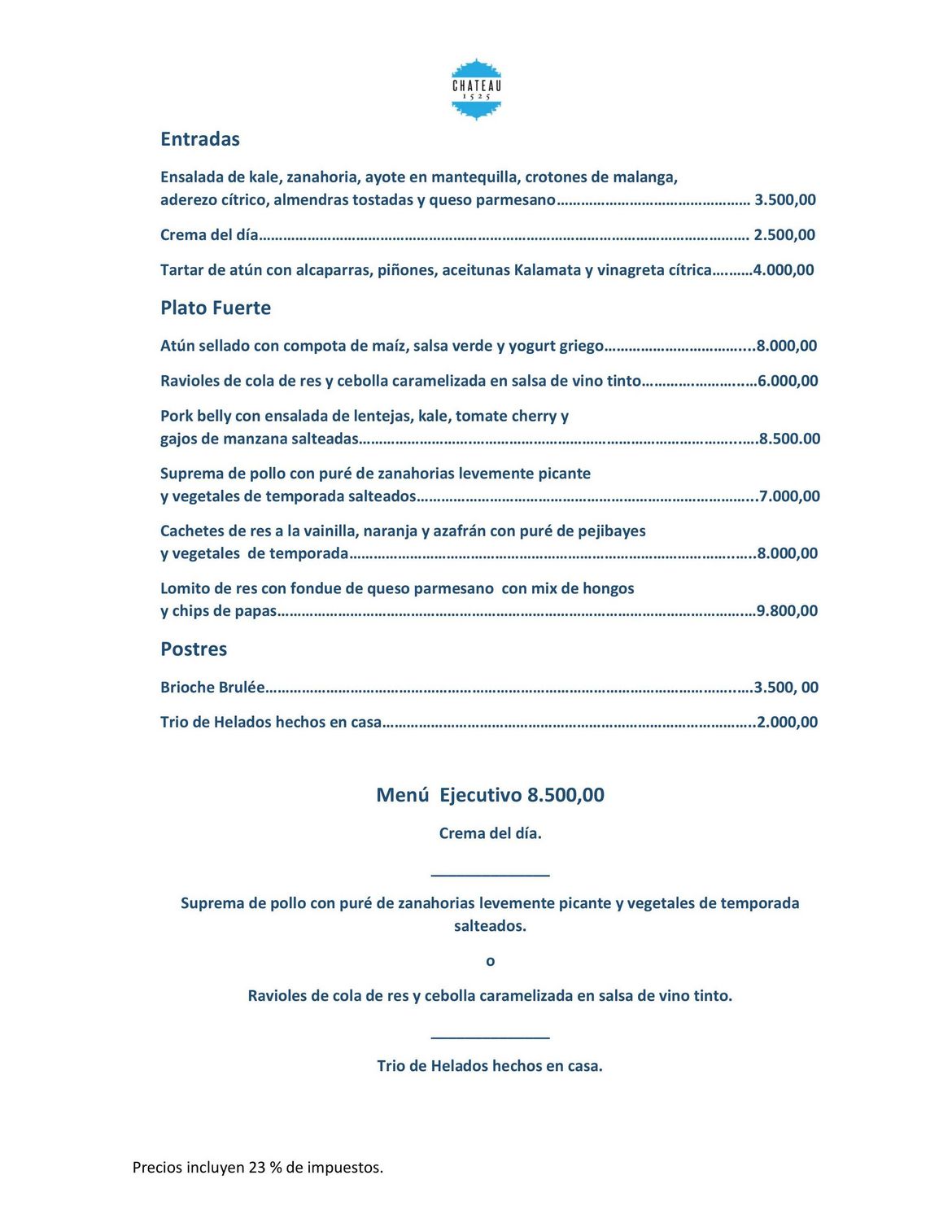 Depuis ce lundi, le restaurant Château 1525 a ré-ouvert ses portes sur le temps du déjeuner et vous accueille avec une nouvelle carte! Le chef vous propose un menu entrée/plat du jour/dessert pour ₡8.500. Menu à retrouver ci-dessous