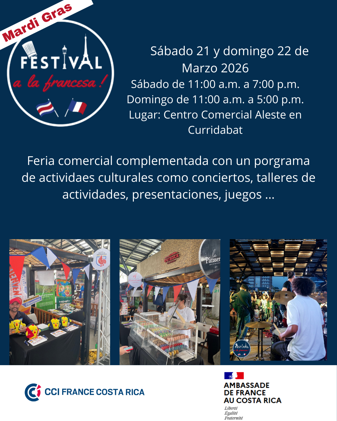 Les 21 et 22 mars 2026, venez célébrer le Mardi Gras - Festival a la Francesa au centre commercial Aleste à Curridabat, dans une ambiance festive, colorée et conviviale.