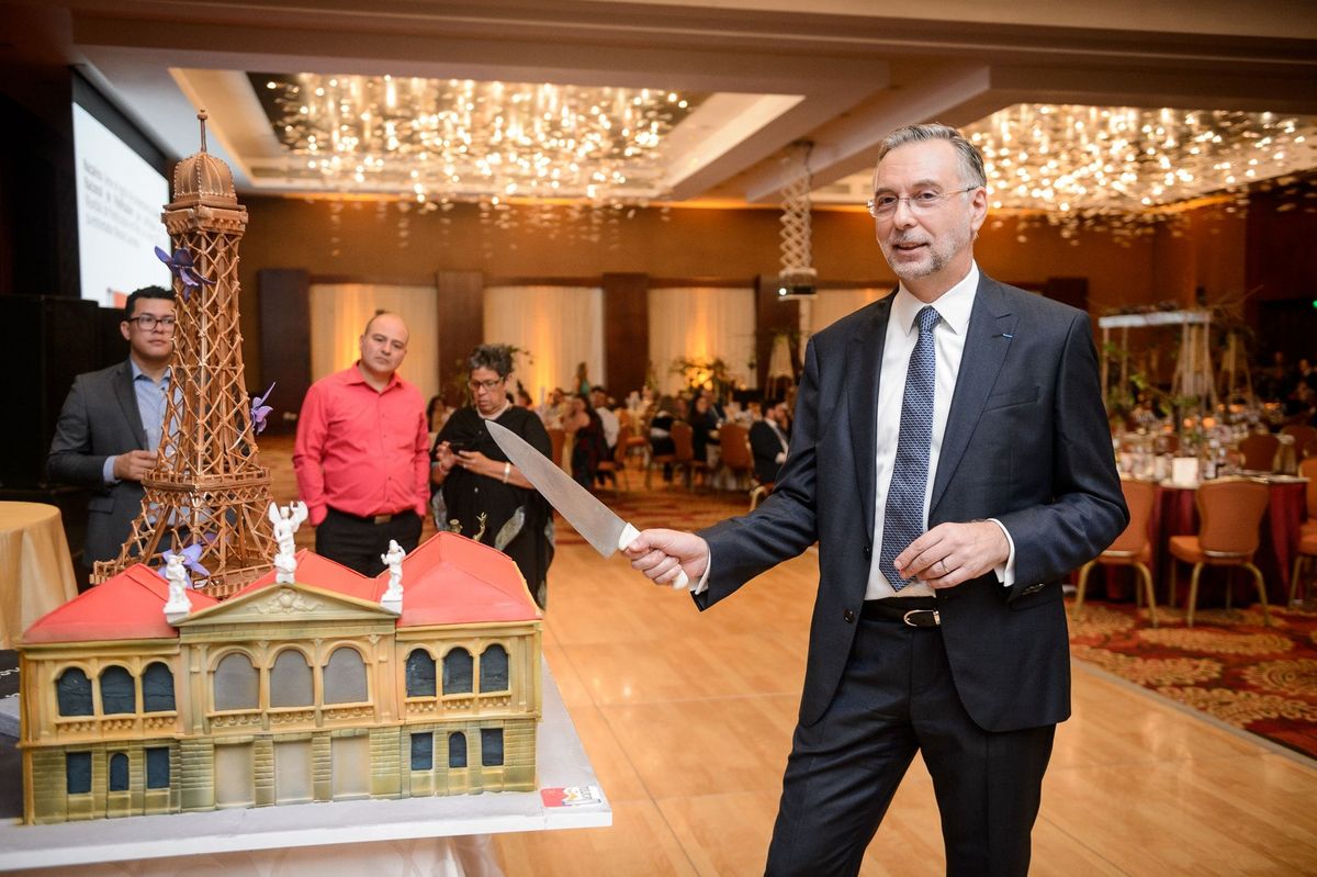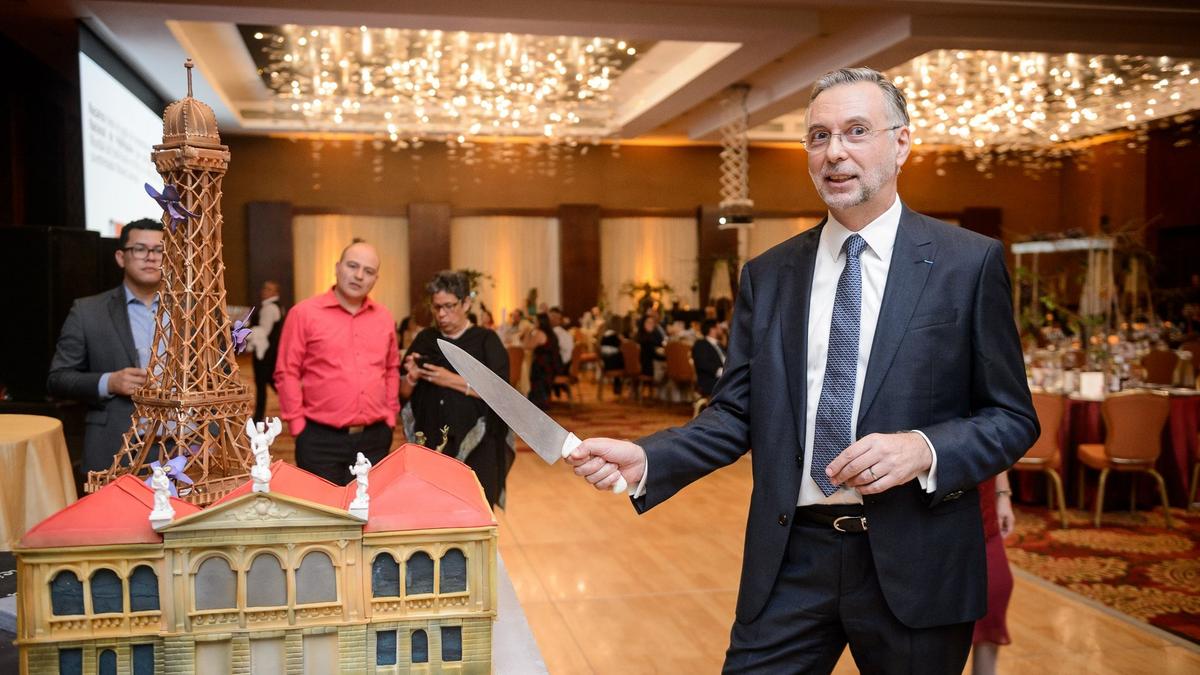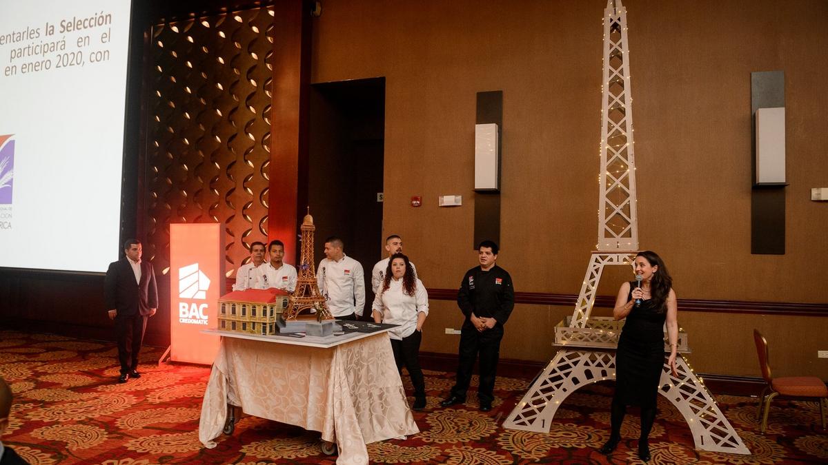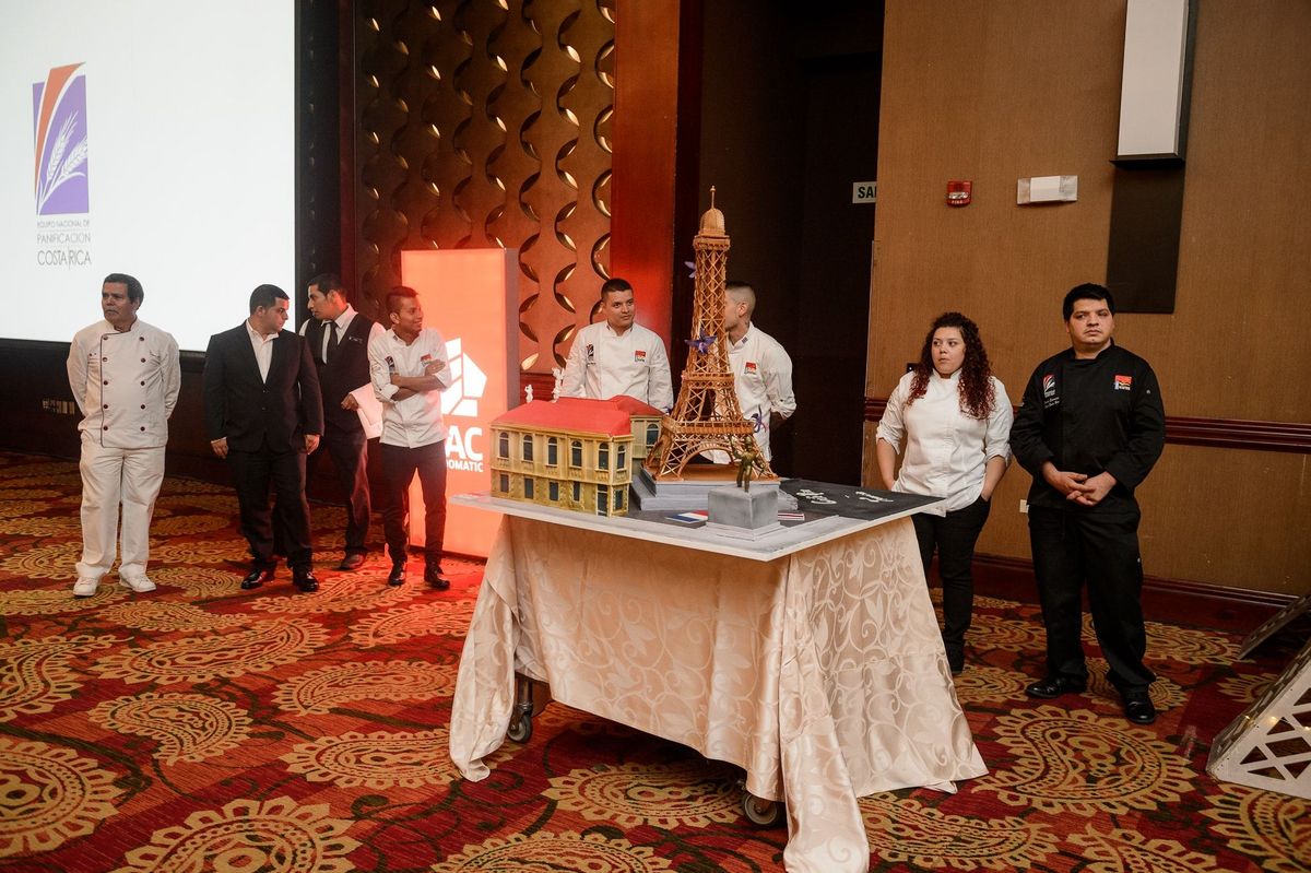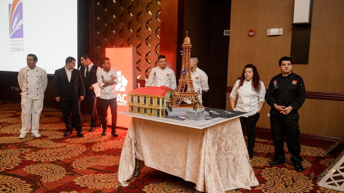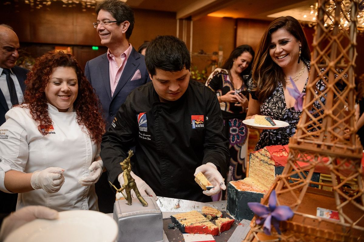 Cette équipe de professionnels de la pâtisserie a confectionné un grand gâteau pour l'évènement, représentant l'amitié franco-costaricienne à travers les symboles de la Tour Eiffel et du Théâtre National du Costa Rica.