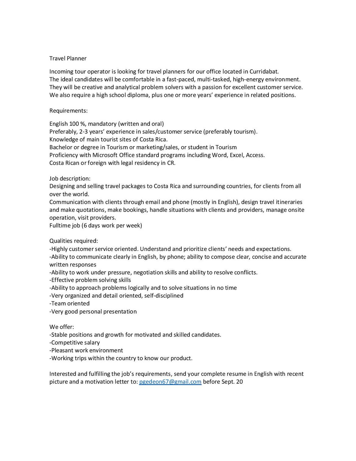 Notre affilié Platinum Travel recherche du personnel pour travailler à Curridabat