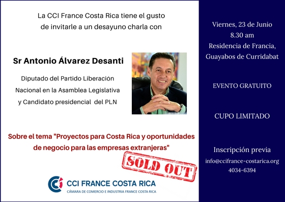 La CCI FRANCE COSTA RICA et l'Ambassadeur de France ont le plaisir de proposer aux affiliés de la Chambre un petit déjeuner débat en présence de Monsieur Antonio Álvarez Desanti, député du Parti de la Libération National à l'Assemblée Législative et candidat présidentiel du PNL.