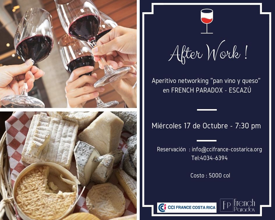 Comme chaque mois, nous avons le plaisir de vous inviter à participer à notre After Work qui aura lieu le mercredi 17 octobre à partir de 7:30pm à French Paradox, Tres Ríos.