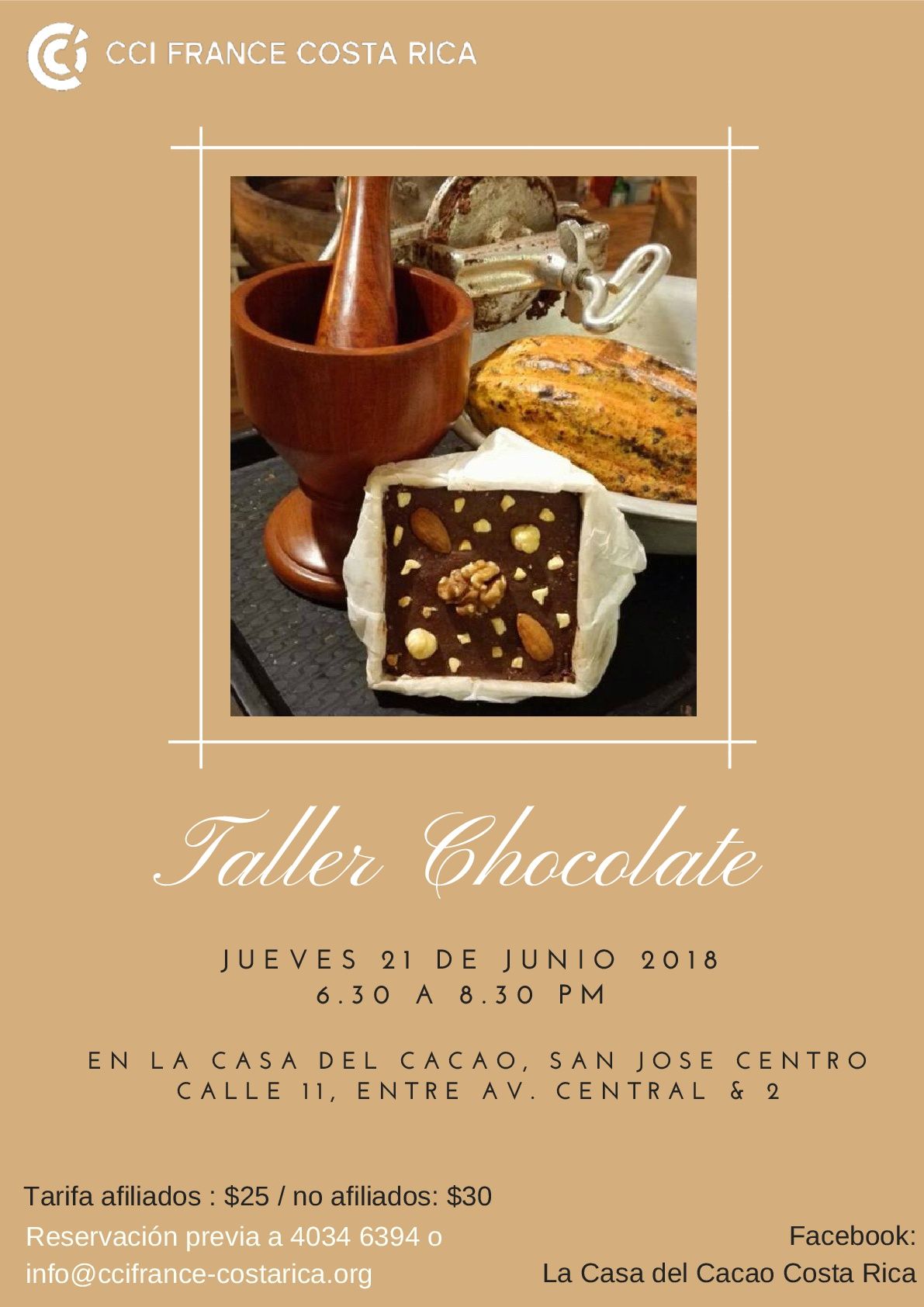 L'événement aura lieu de 6.30 à 8.30pm dans le magasin de notre affilié La Casa del Cacao entre la Avenida Central et la Avenida 2.