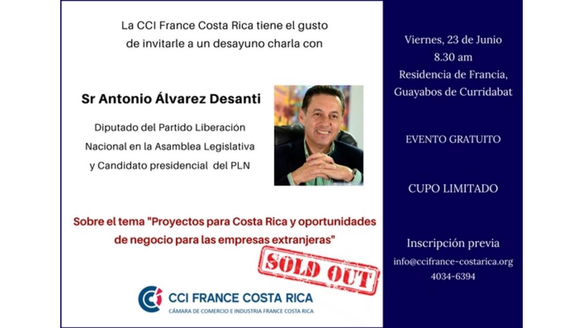 La CCI FRANCE COSTA RICA y el Embajador de Francia tienen el gusto de proponer a sus afiliados una charla desayuno con el Señor Antonio Álvarez Desanti Diputado del Partido Liberación Nacional en la Asamblea Legislativa y Candidato presidencial del PNL sobre el tema "Proyectos para Costa Rica u oportunidades de negocio para las empresas extranjeras".