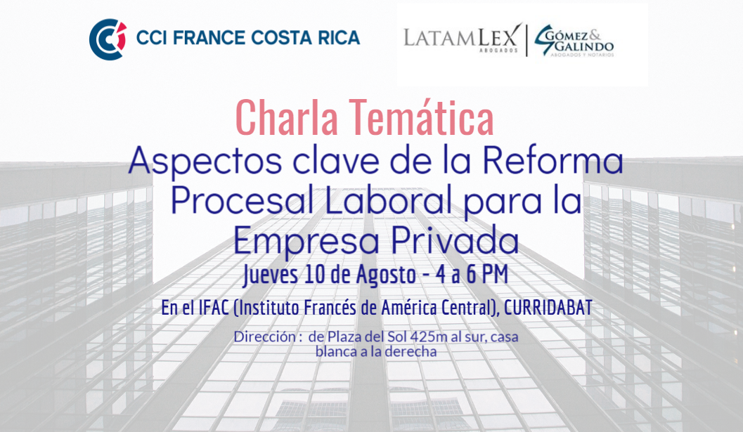 La CCI France Costa Rica tiene el agrado de invitarle a participar a nuestra próxima charla sobre el tema ¨Aspectos clave de la Reforma Procesal Laboral para la Empresa Privada¨.