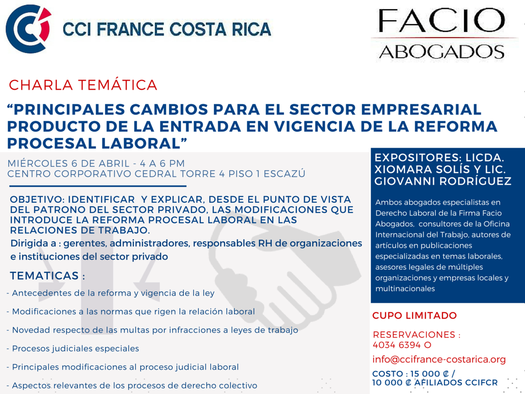 La CCI FRANCE COSTA RICA, en colaboración con FACIO ABOGADOS, organiza una Charla sobre el tema de la Reforma Procesal Laboral, el miércoles 6/04, de 4 a 6 pm en el Centro corporativo cedral Torre 4 Piso 1, en Escazú.