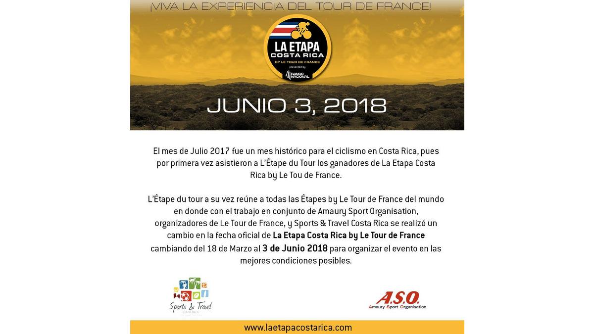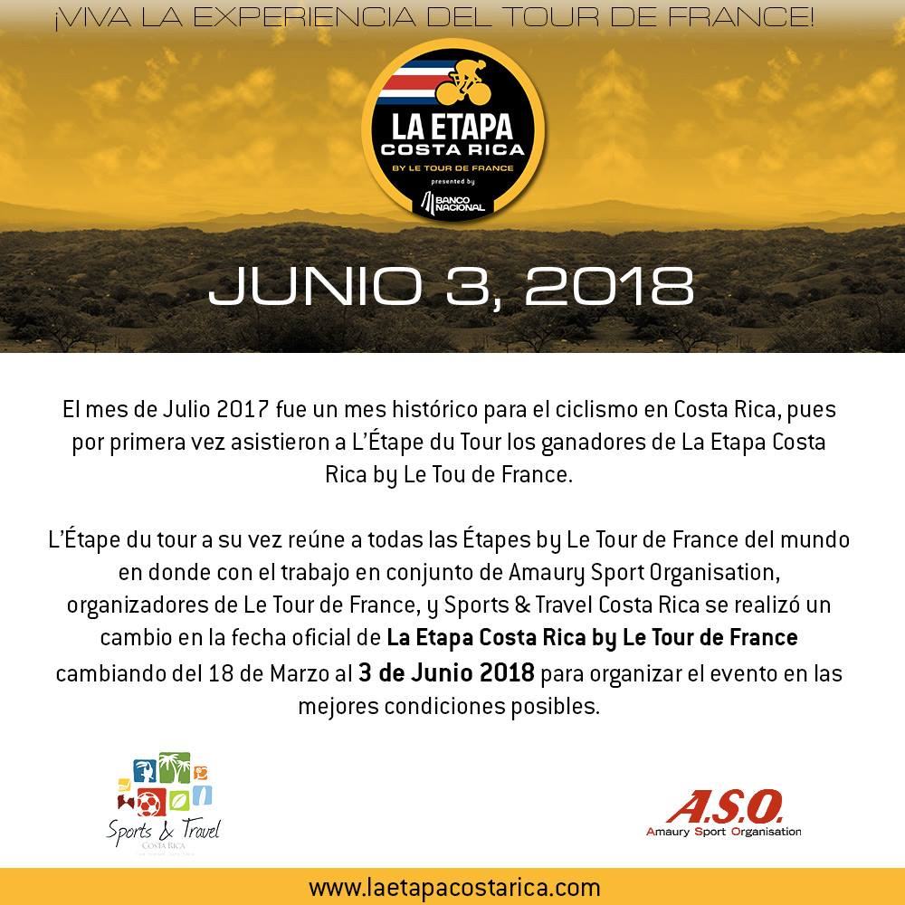 El equipo de Sports and Travel Costa Rica cambia la fecha de la segunda edición de La Etapa Costa Rica by Le Tour de France, para una mejor adecuación con el calendario internacional. El evento se desarrollará entonces el 03 de junio del 2018.
