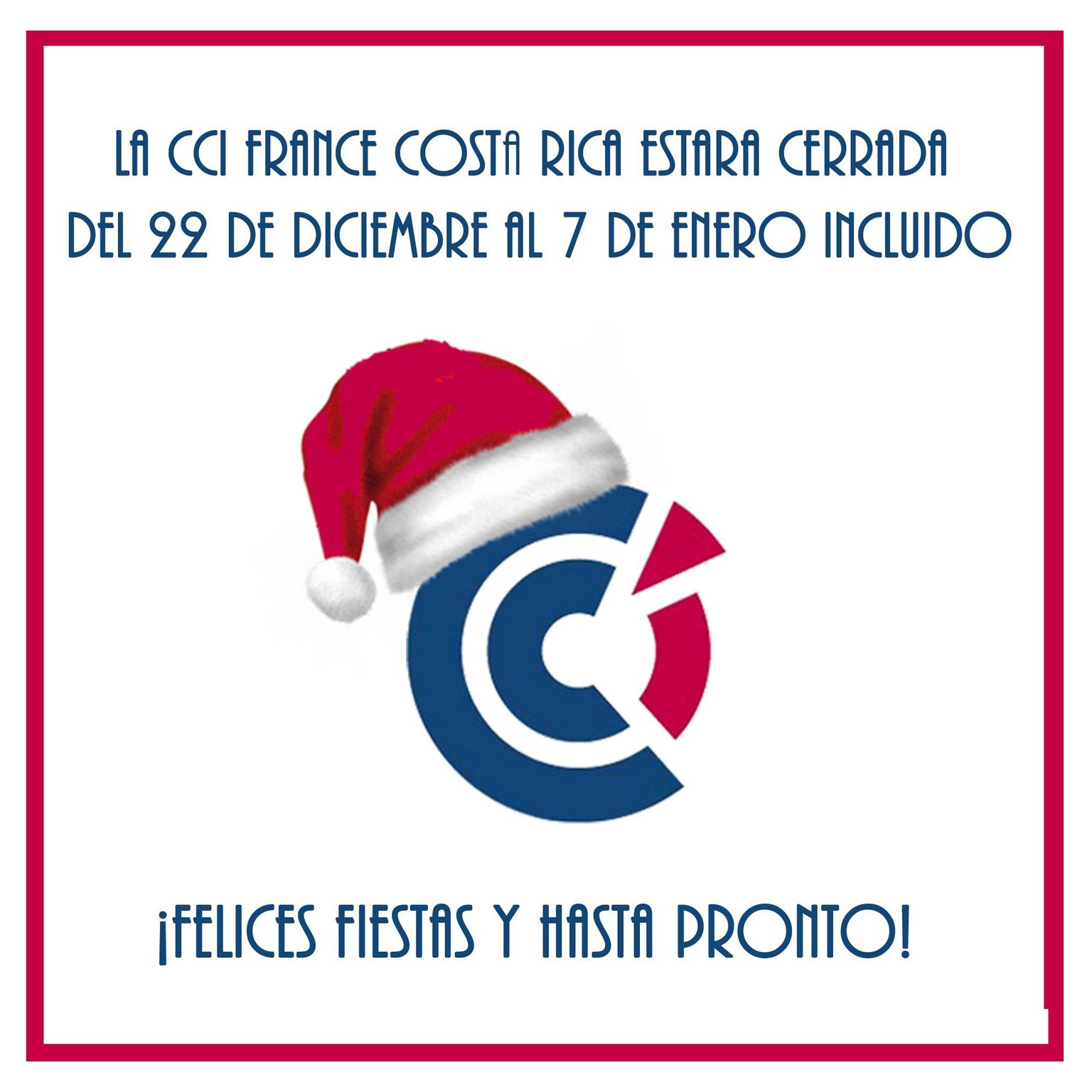 Les informamos que la Cámara de Comercio France Costa Rica estará cerrada del 22 de diciembre al 7 de enero.