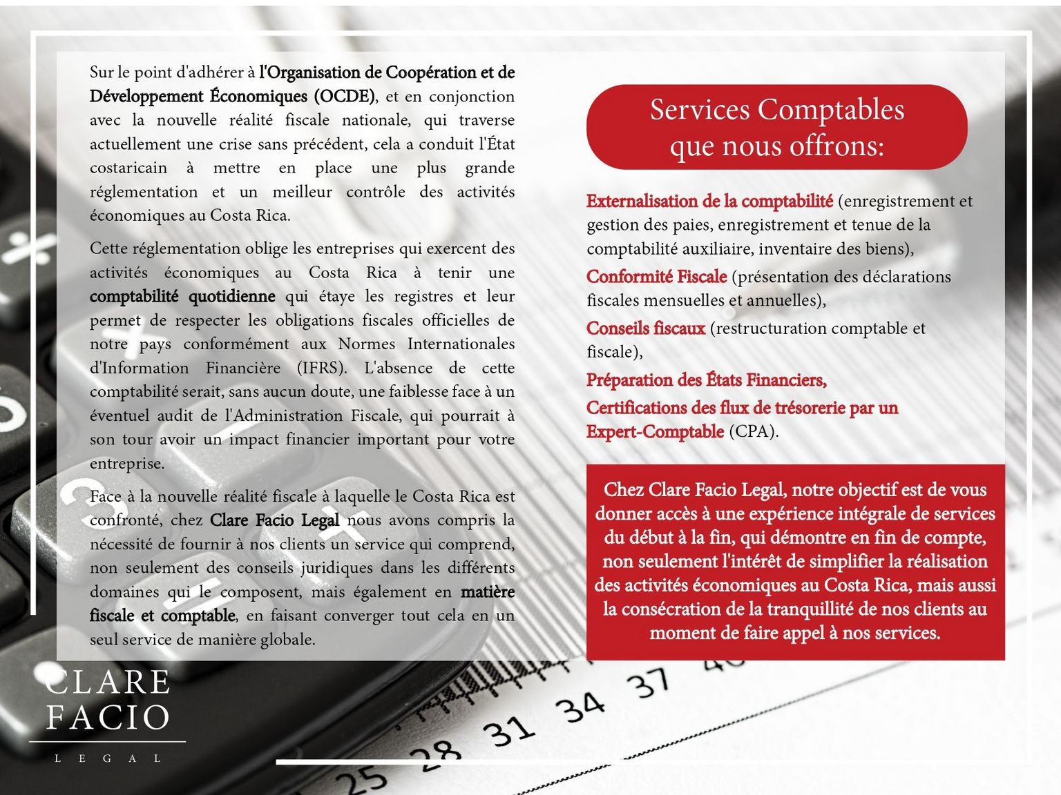 Tenemos el gusto de compartirles esta información por parte del Bufete Clare Facio Legal, basado en San José y Tamarindo, sobre su nueva oferta de servicios contables en francés.