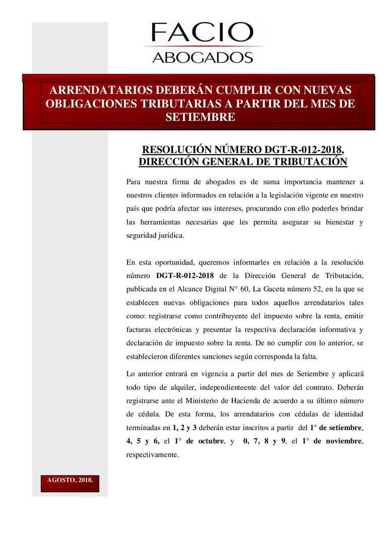 La Dirección General de Tributación acaba de publicar la resolución DGT-R-012-2018, que establece nuevas obligaciones fiscales para los…