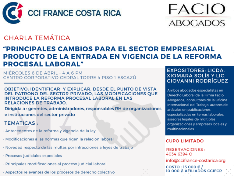 La CCI FRANCE COSTA RICA, en colaboración con FACIO ABOGADOS, organiza una Charla sobre el tema de la Reforma Procesal Laboral, el miércoles 6/04, de…
