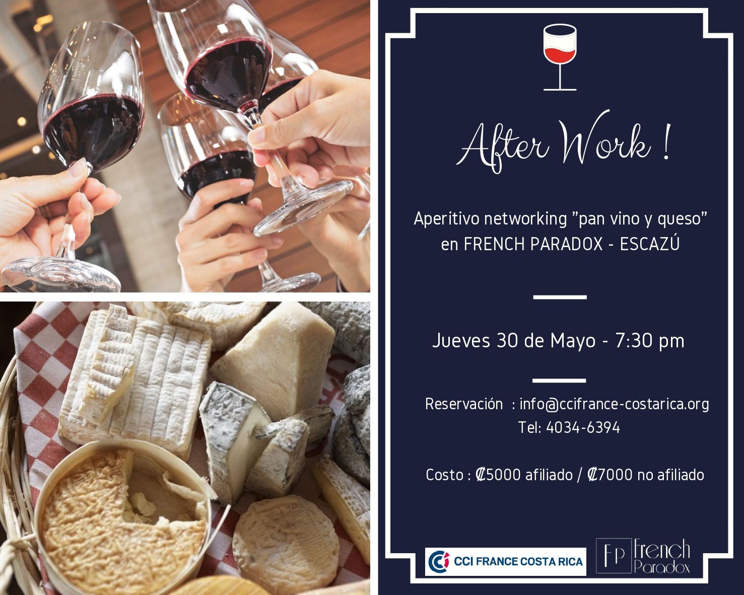 Nous avons le plaisir de vous inviter à notre prochain Afterwork, dans le magasin French Paradox d'Escazú, le jeudi 30 mai 2019 à partir de 19h30.