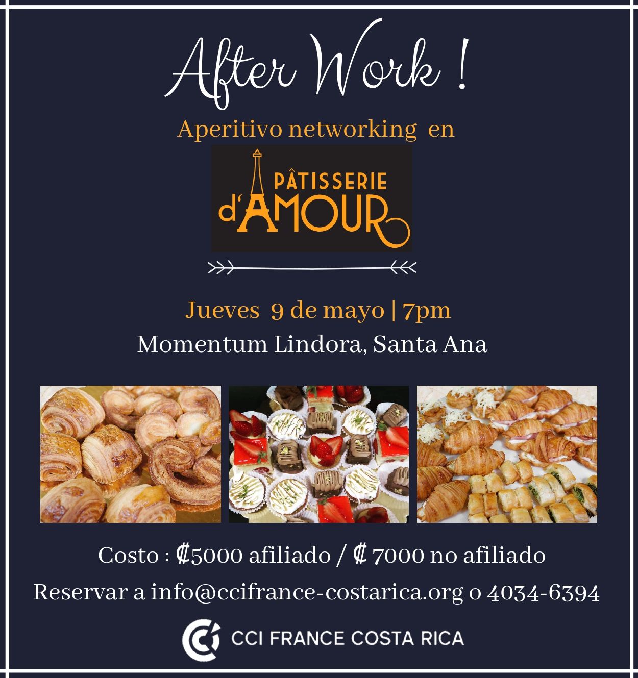 Participation de 5 000 colons pour les affiliés, et de 7 000 colons pour les non affiliés. Réservation à info(@)ccifrance-costarica.org, ou au 4034-6394.