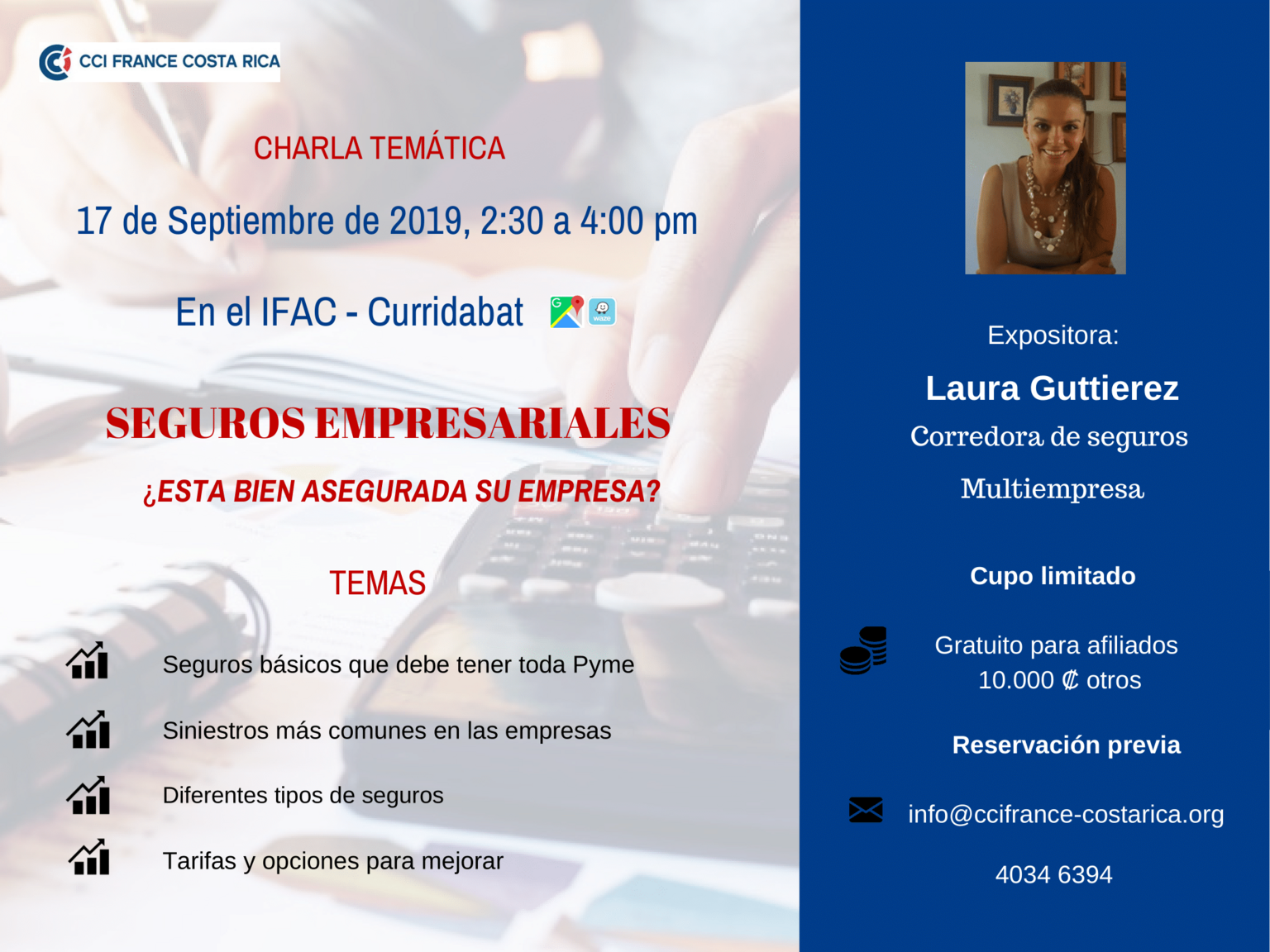 Nous vous invitons à participer à la conférence sur l’assurance des entreprises, en présence de Laura Gutierrez, consultante de BMI Seguros de Costa Rica.