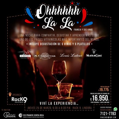 Nous avons le plaisir de vous inviter à une soirée de dégustation et de découverte des vins français. L'activité aura lieu le jeudi 25 mars au nouveau magasin "Rack 9" de notre affilié Grupo Pampa, situé à Lindora, de 18h30 à 20h30 et est limitée à un maximum de 20 personnes.