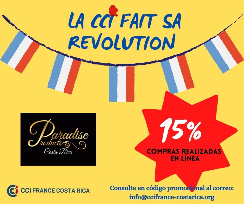 En tant que membre de la CCI France Costa Rica, vous pouvez bénéficier d'une réduction de 15% sur la boutique en ligne Paradise Products avec un code promotionnel. Consultez ce code par e-mail : info@ccifrance-costarica.org