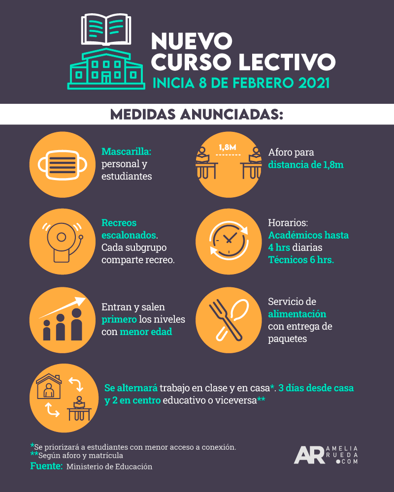 Les étudiants doivent se rendre à l'établissement d'enseignement deux jours par semaine et trois jours, ils recevront des cours à la maison. Cela sera fait en suivant les mesures sanitaires résumées dans l'image suivante.